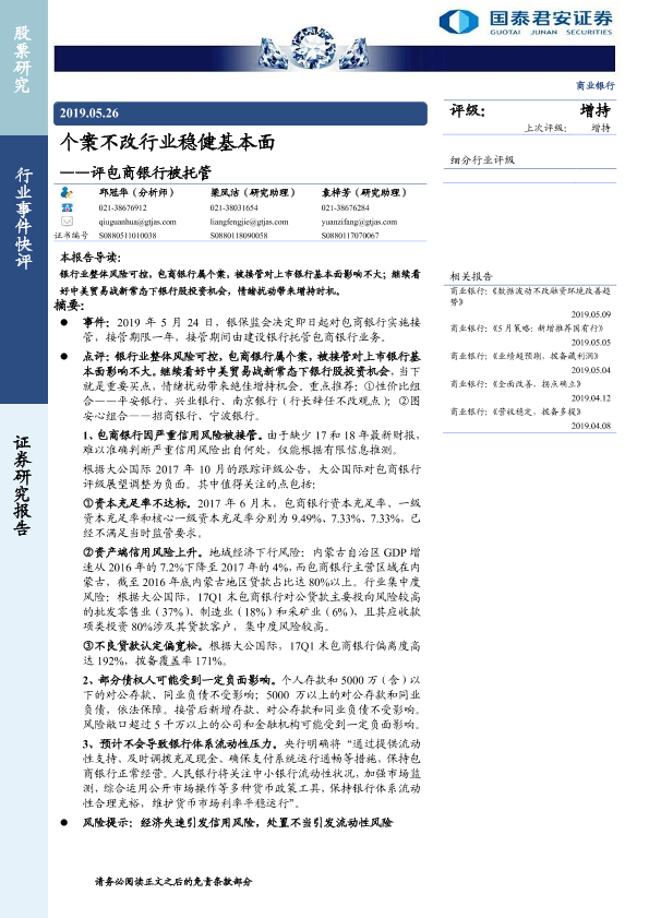 【国泰君安证券】【20190526】评包商银行被托管:个案不改行业稳健基本面-6页