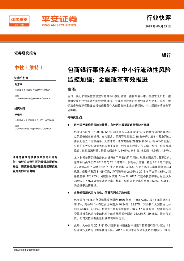 【平安证券】【20190527】包商银行事件点评:中小行流动性风险监控加强;金融改革有效推进-3页