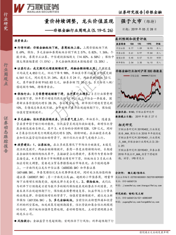 【万联证券】【20190528】非银金融行业周观点:量价持续调整,龙头价值显现-13页