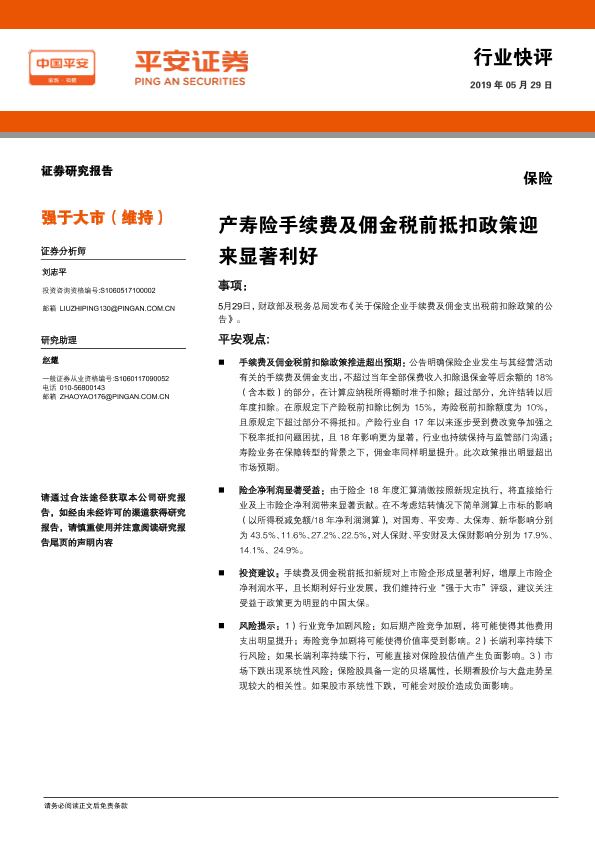 【平安证券】【20190529】保险:产寿险手续费及佣金税前抵扣政策迎来显著利好-3页