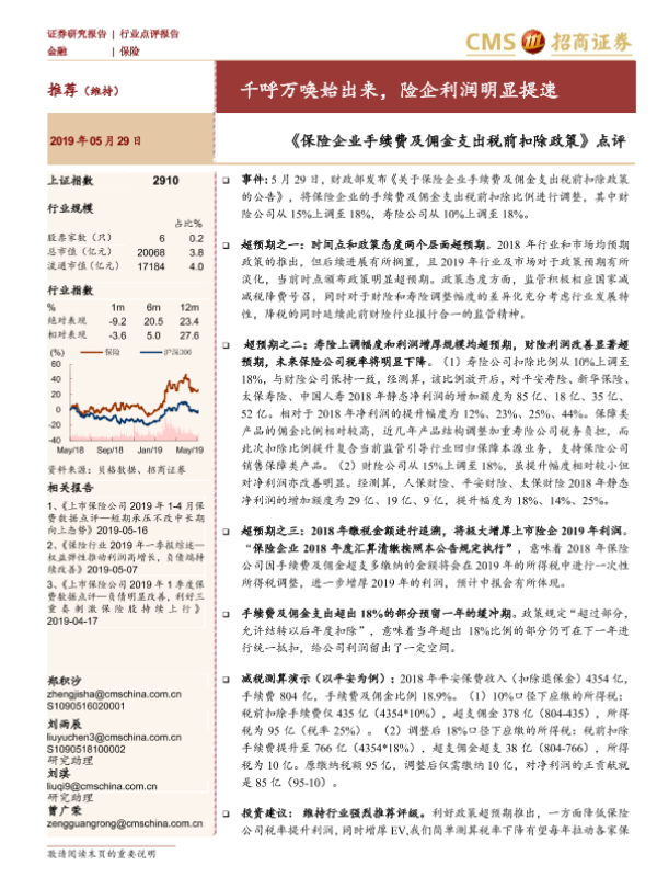 【海通证券】【20190529】保险企业手续费及佣金支出税前扣除政策点评:千呼万唤始出来,险企利润明显提速-4页