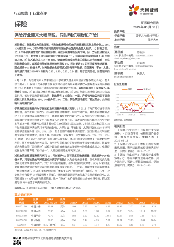 【天风证券】【20190530】保险行业迎来大幅降税,同时利好寿险和产险-3页