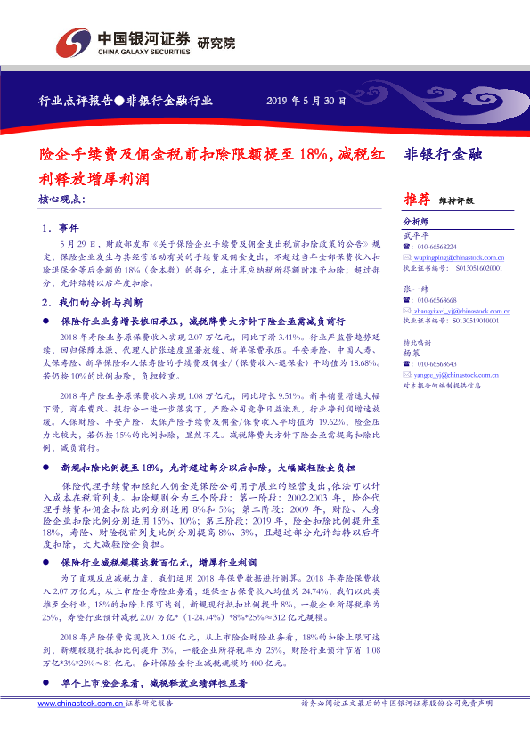 【银河证券】【20190530】险企手续费及佣金税前扣除限额提至18%,减税红利释放增厚利润-5页