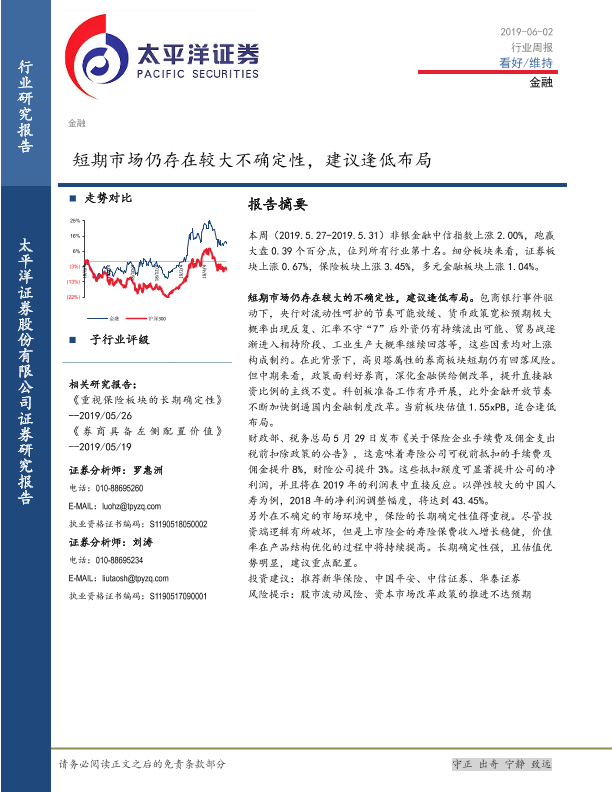 【太平洋证券】【20190602】金融行业周报:短期市场仍存在较大不确定性,建议逢低布局-13页