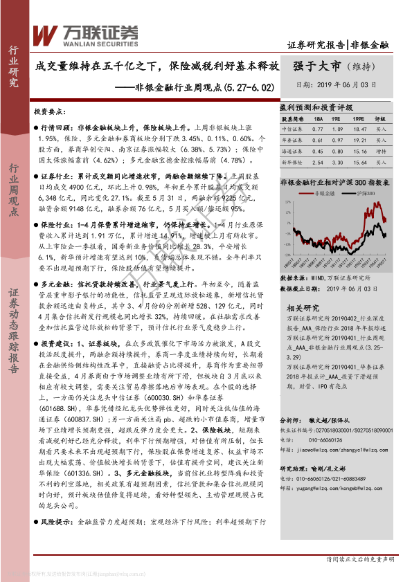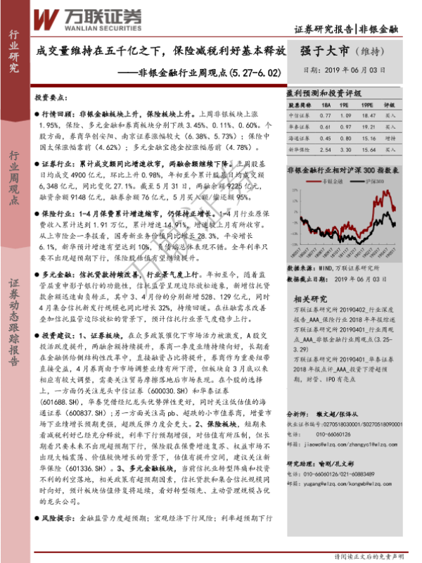 【万联证券】【20190603】非银金融行业周观点:成交量维持在五千亿之下,保险减税利好基本释放-14页