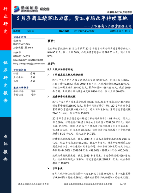 【渤海证券】【20190610】上市券商5月经营数据点评:5月券商业绩环比回落,资本市场改革持续落地-12页