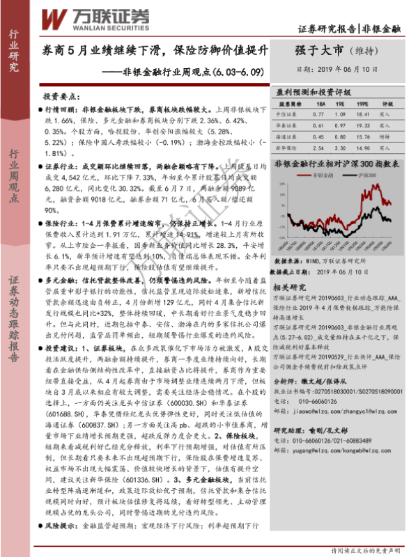 【万联证券】【20190610】非银金融行业周观点:券商5月业绩继续下滑,保险防御价值提升-14页