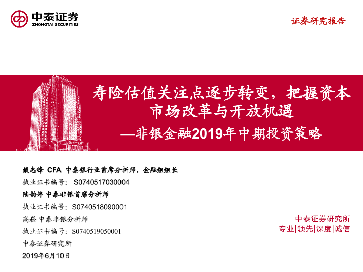 【中泰证券】【20190610】非银金融2019年中期投资策略:寿险估值关注点逐步转变,把握资本市场改革与开放机遇-32页