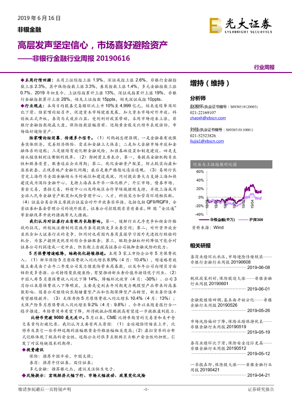 【光大证券】【20190616】非银行金融行业周报:高层发声坚定信心,市场喜好避险资产-17页