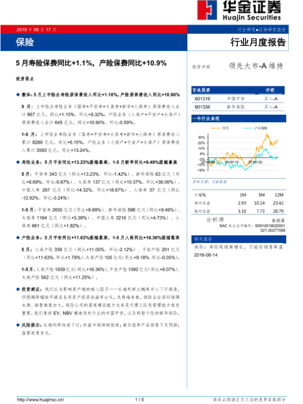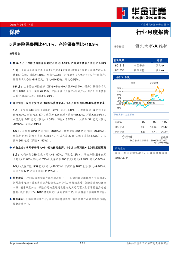【华金证券】【20190617】5月寿险保费同比+1.1%,产险保费同比+10.9%-5页