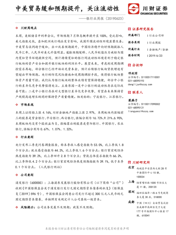 【川财证券】【20190623】银行业周报:中美贸易缓和预期提升,关注流动性-12页