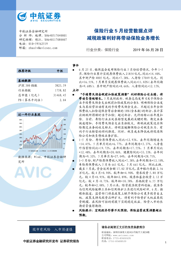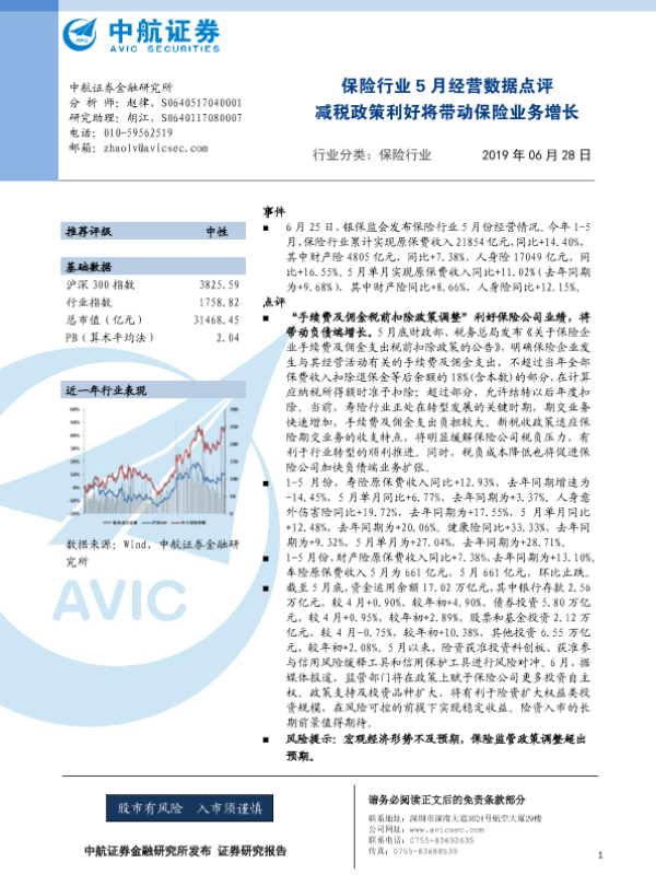 【中航证券】【20190628】保险行业5月经营数据点评:减税政策利好将带动保险业务增长-4页