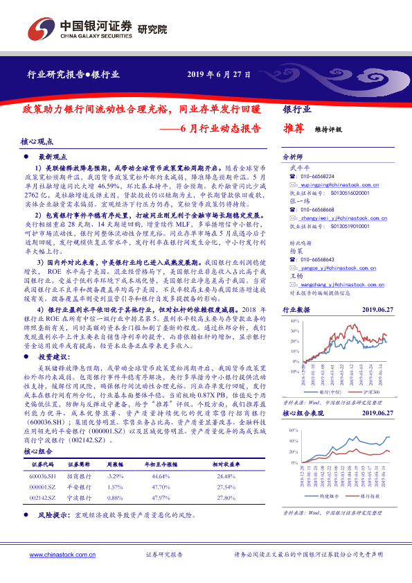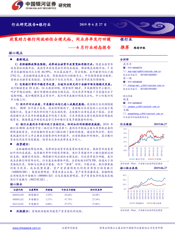 【银河证券】【20190627】银行业6月行业动态报告:政策助力银行间流动性合理充裕,同业存单发行回暖-46页