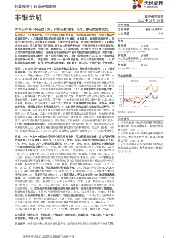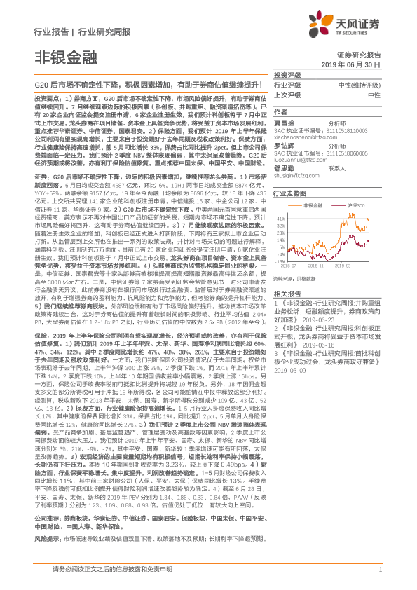 【天风证券】【20190630】非银金融行业研究周报:G20后市场不确定性下降,积极因素增加,有助于券商估值继续提升!-9页