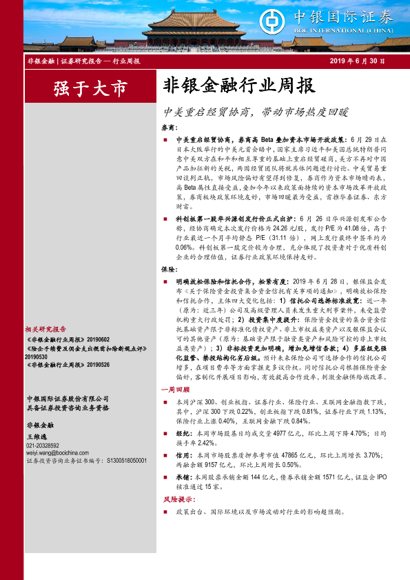 【中银证券】【20190630】非银金融行业周报:中美重启经贸协商,带动市场热度回暖-14页