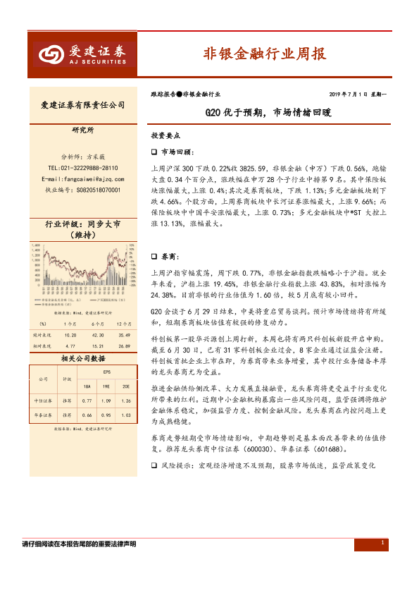 【爱建证券】【20190701】非银金融行业周报:G20优于预期,市场情绪回暖-11页