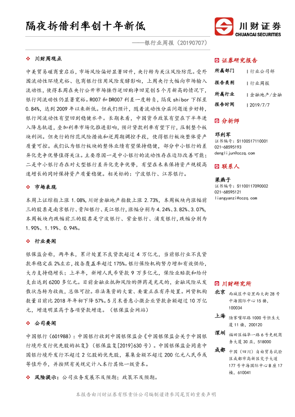 【川财证券】【20190707】银行业周报:隔夜拆借利率创十年新低-11页