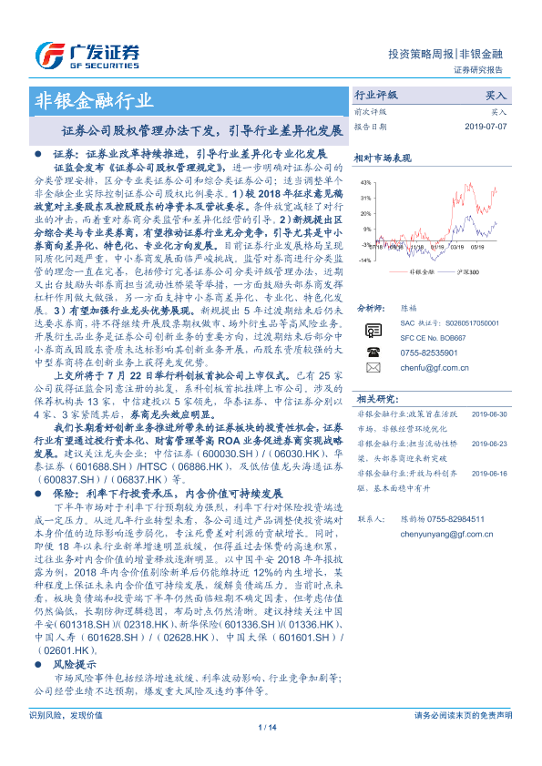 【广发证券】【20190707】非银金融行业投资策略周报:证券公司股权管理办法下发,引导行业差异化发展-14页