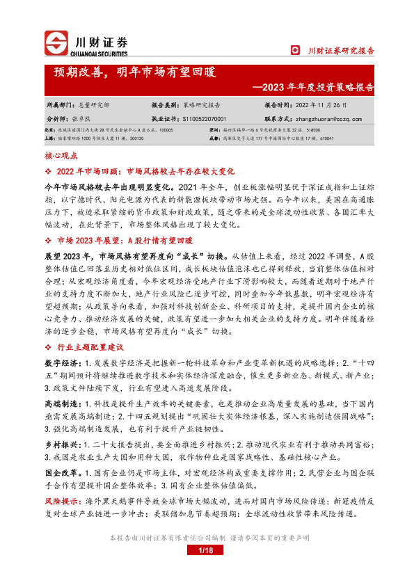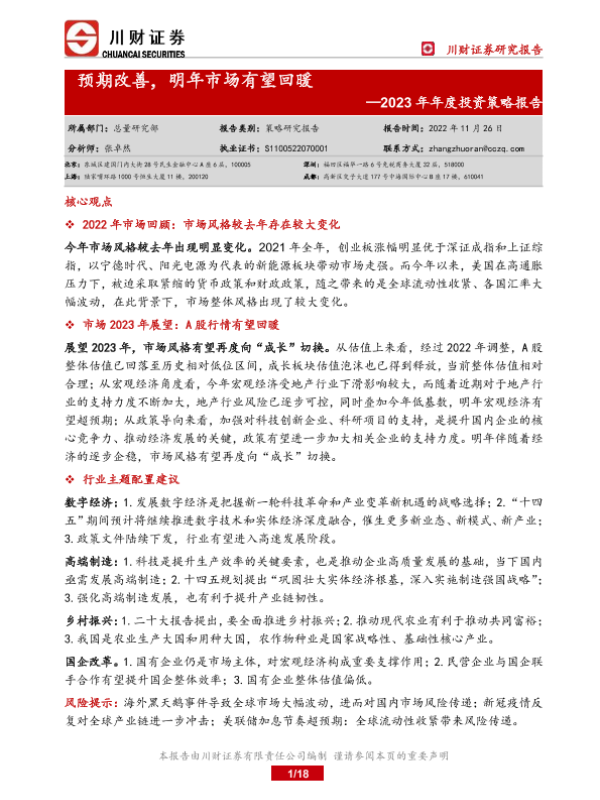 【川财证券】【20221126】2023年年度投资策略报告:预期改善,明年市场有望回暖-18页
