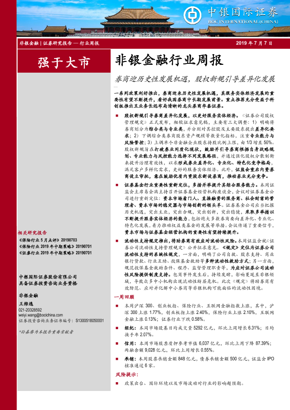 【中银证券】【20190707】非银金融行业周报:券商迎历史性发展机遇,股权新规引导差异化发展-14页