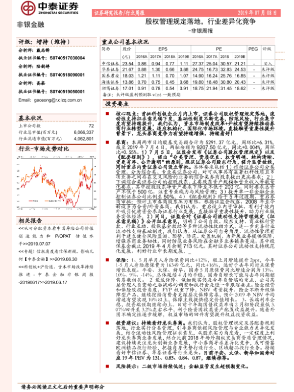 【中泰证券】【20190708】非银周报:股权管理规定落地,行业差异化竞争-14页