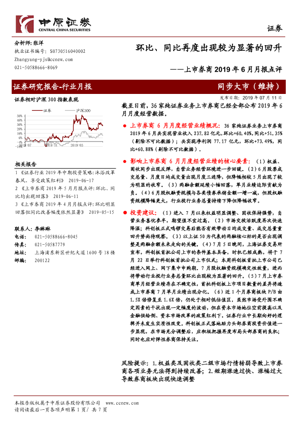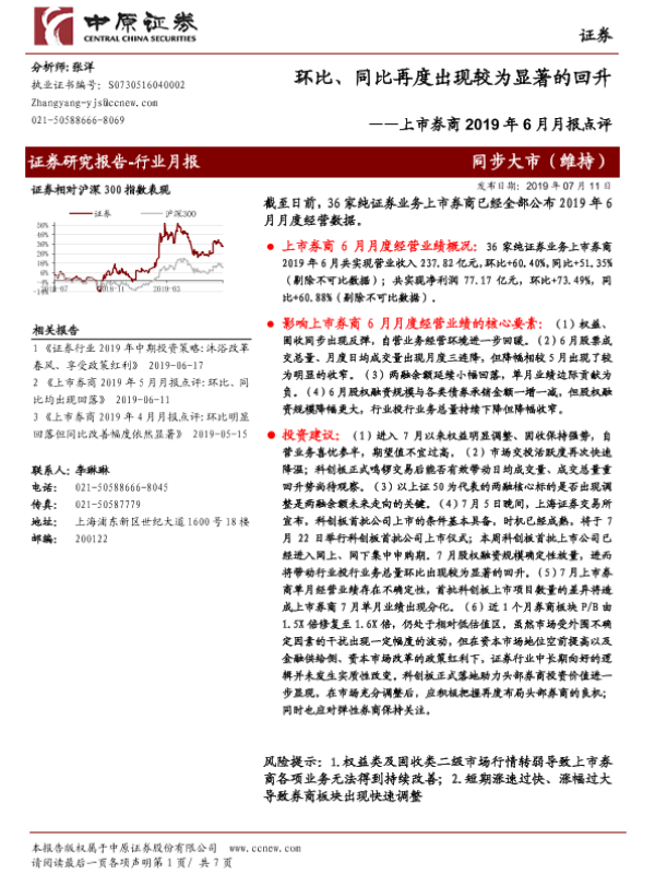 【中原证券】【20190711】上市券商2019年6月月报点评:环比、同比再度出现较为显著的回升-7页