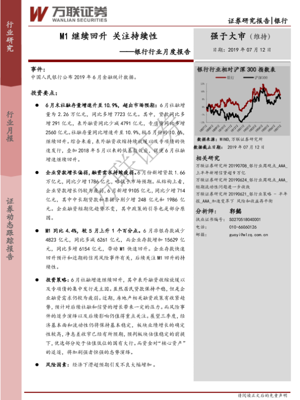 【万联证券】【20190712】银行行业月度报告:M1继续回升 关注持续性-5页