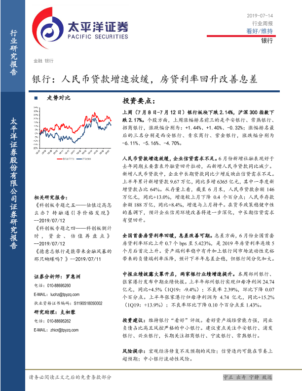 【太平洋证券】【20190714】银行行业周报:人民币贷款增速放缓,房贷利率回升改善息差-16页