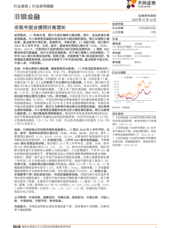 【天风证券】【20190714】非银金融行业研究周报:非银中报业绩预计高增长-9页