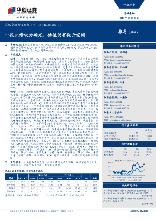 【华创证券】【20190714】非银金融行业周报:中报业绩较为确定,估值仍有提升空间-20页