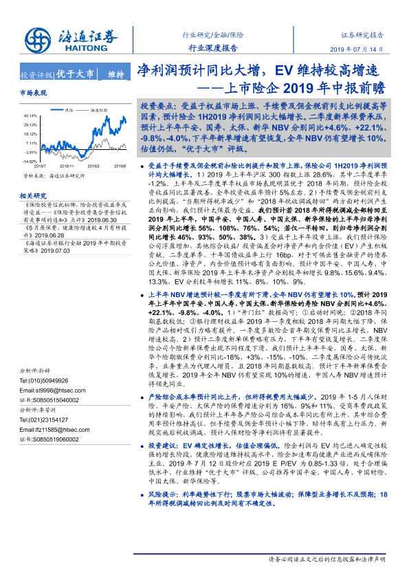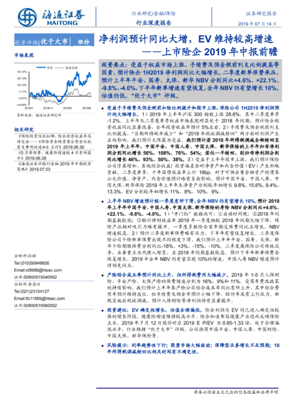 【海通证券】【20190714】上市险企2019年中报前瞻:净利润预计同比大增,EV维持较高增速-15页