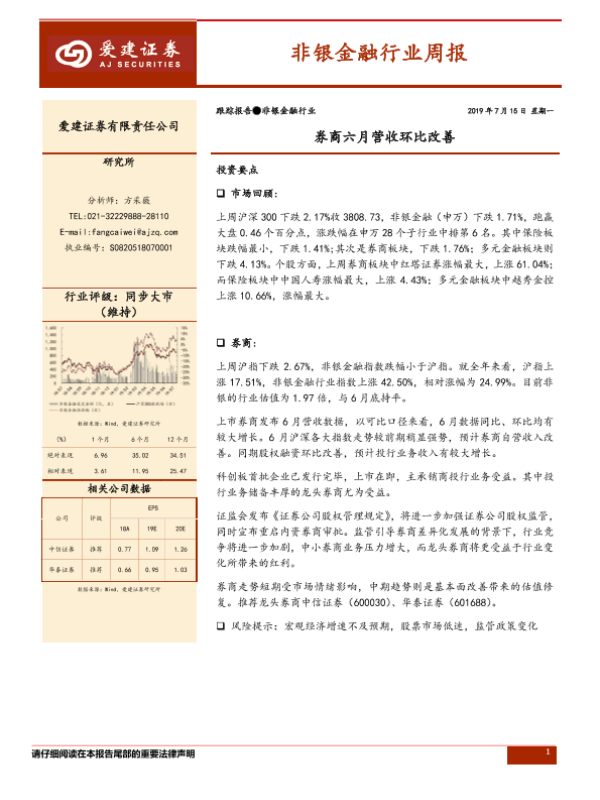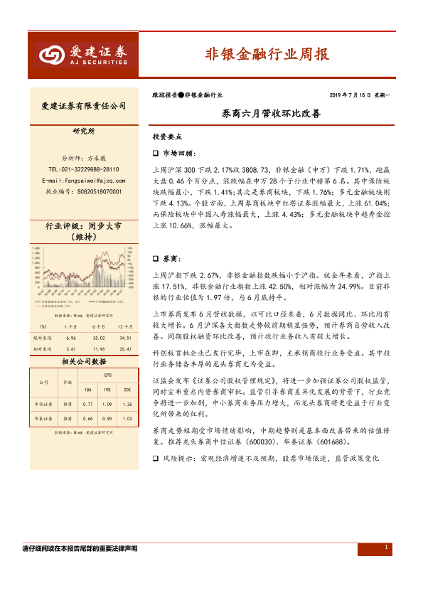 【爱建证券】【20190715】非银金融行业周报:券商六月营收环比改善-12页