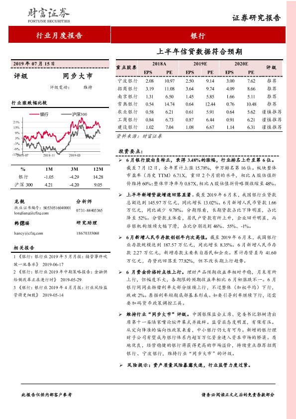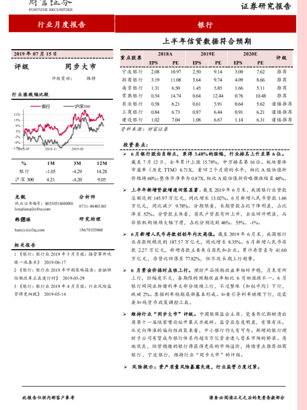 【财信证券】【20190715】银行行业月度报告:上半年信贷数据符合预期-10页