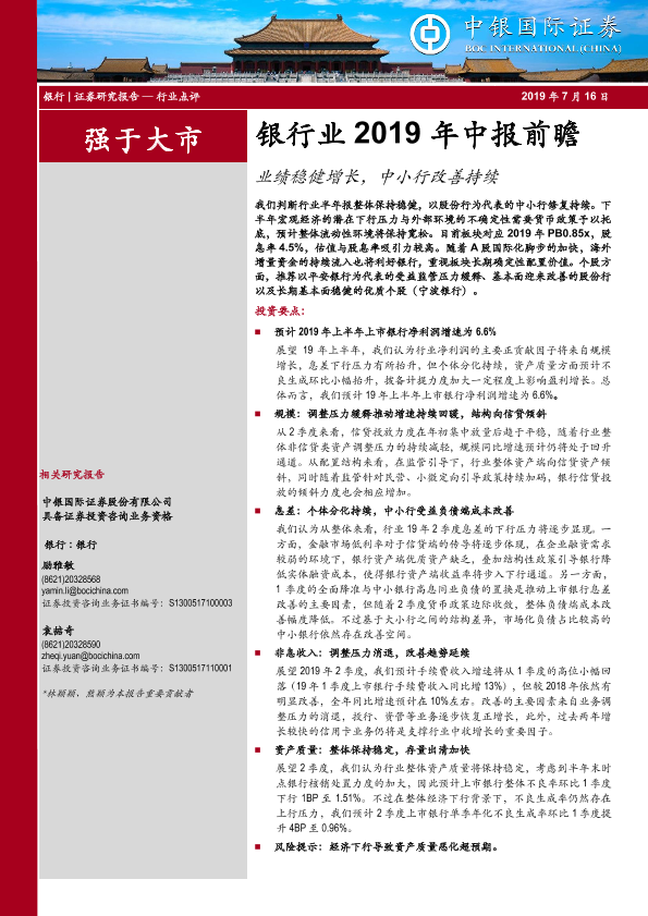 【中银证券】【20190716】银行业2019年中报前瞻:业绩稳健增长,中小行改善持续-6页