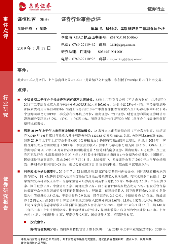 【东莞证券】【20190717】证券行业事件点评:半年报、科创板、美联储降息三预期叠加分析-3页