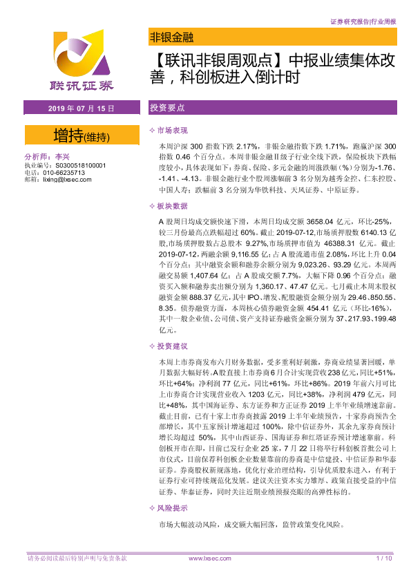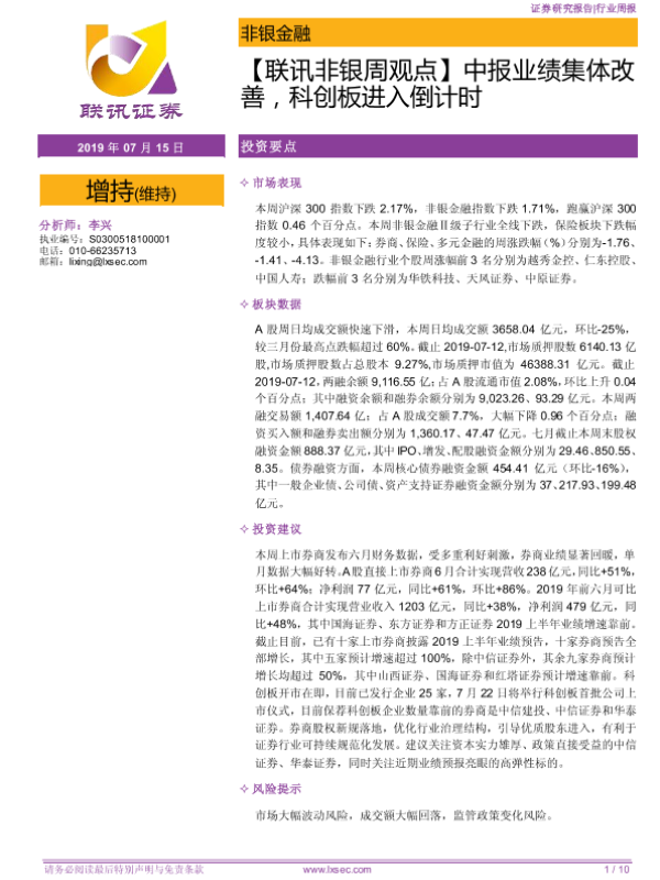 【粤开证券】【20190715】联讯非银周观点:中报业绩集体改善,科创板进入倒计时-10页