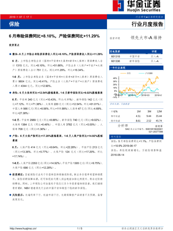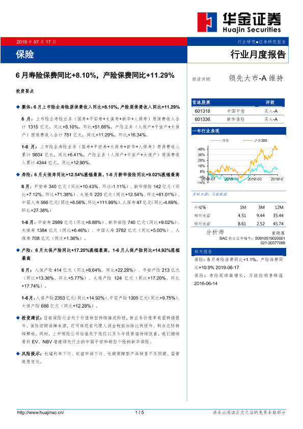 【华金证券】【20190717】保险行业月度报告:6月寿险保费同比+8.10%,产险保费同比+11.29%-5页