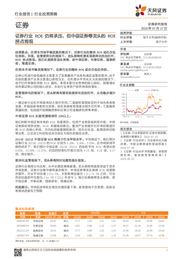 【天风证券】【20190717】证券行业ROE仍将承压,但中信证券等龙头的ROE拐点将现-16页