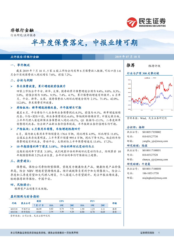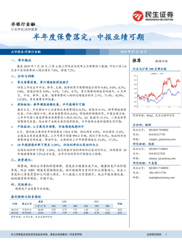 保费收入 保险 半年报 投资建议 非银行金融