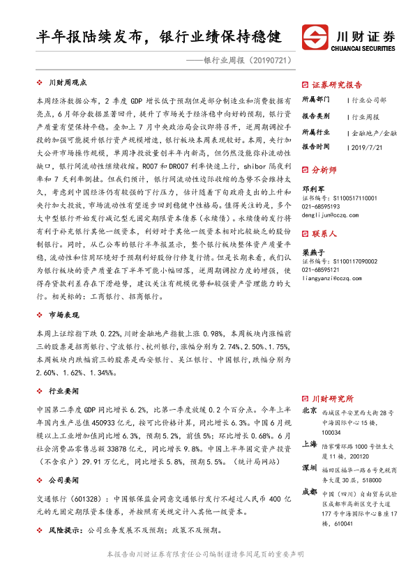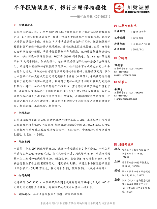 【川财证券】【20190721】银行业周报:半年报陆续发布,银行业绩保持稳健-12页