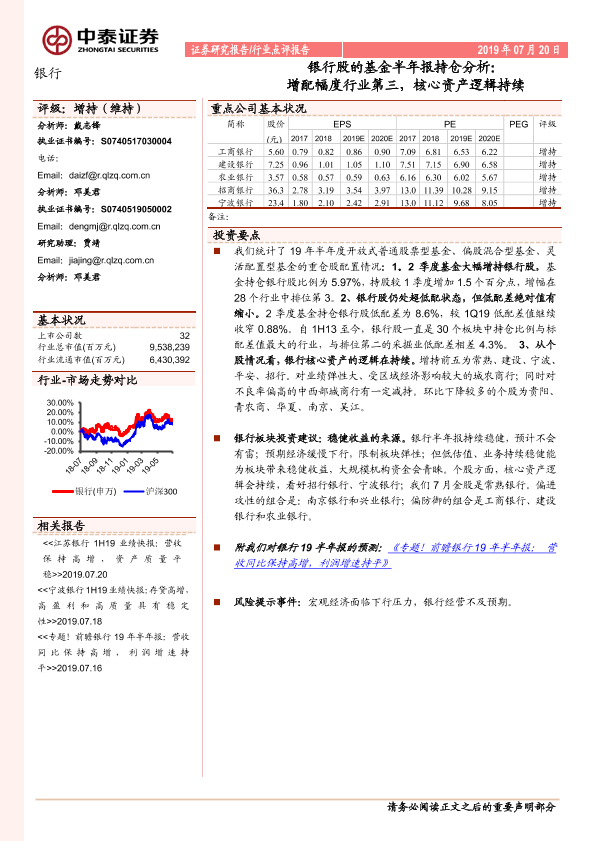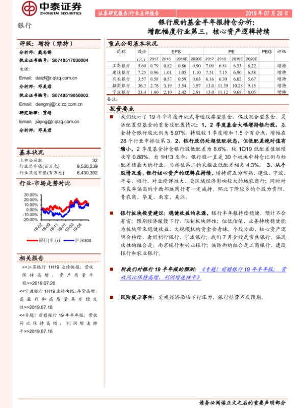 【中泰证券】【20190720】银行股的基金半年报持仓分析:增配幅度行业第三,核心资产逻辑持续-8页
