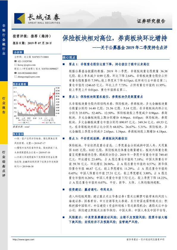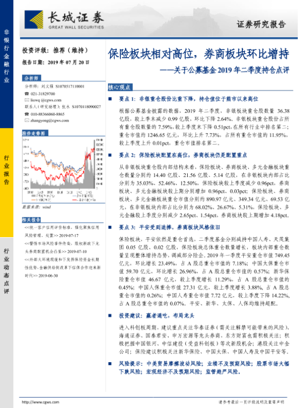 【长城证券】【20190720】公募基金2019年二季度持仓点评:保险板块相对高位,券商板块环比增持-12页