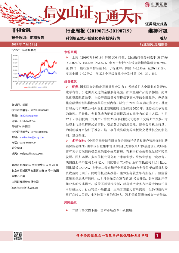 【山西证券】【20190721】非银金融行业周报:科创板正式开板催化券商板块行情-8页