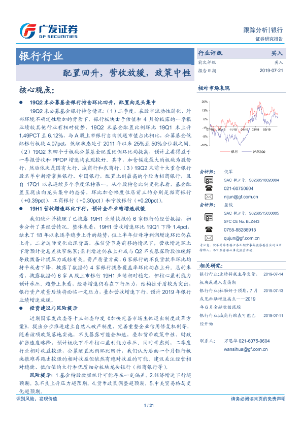 【广发证券】【20190721】银行行业:配置回升,营收放缓,政策中性-21页