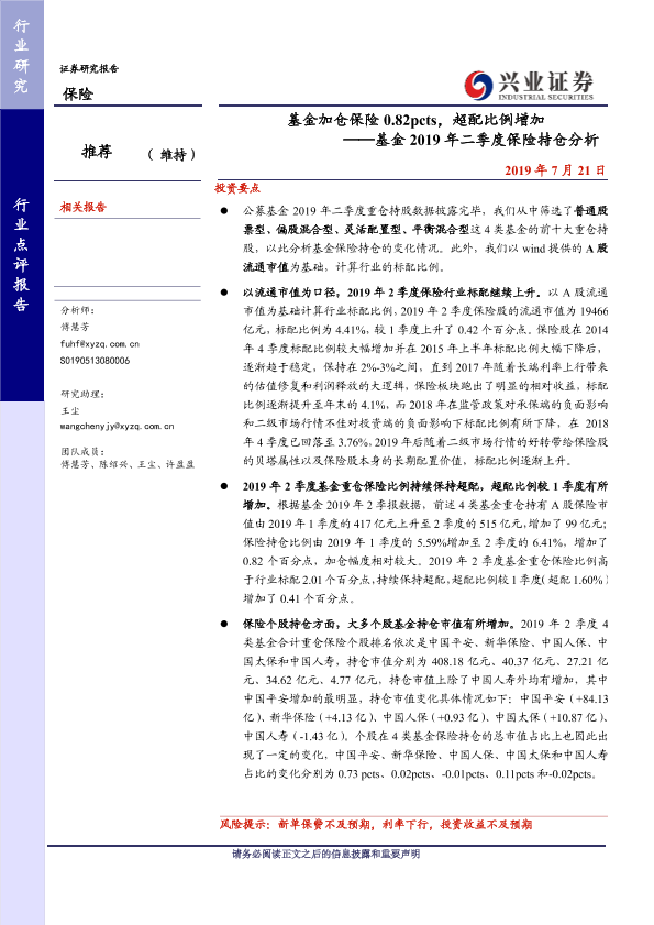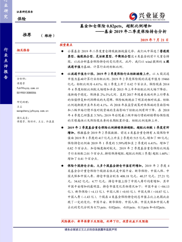 【兴业证券】【20190721】基金2019年二季度保险持仓分析:基金加仓保险0.82pcts,超配比例增加-5页