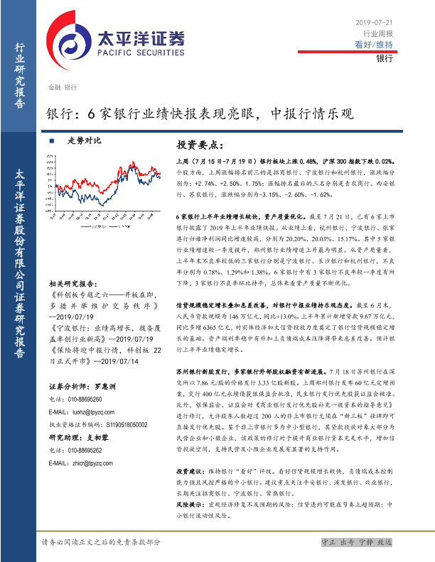 【太平洋证券】【20190721】银行行业周报:6家银行业绩快报表现亮眼,中报行情乐观-17页