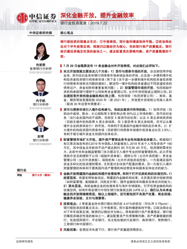 【中信证券】【20190722】银行业投资观察:深化金融开放,提升金融效率-11页