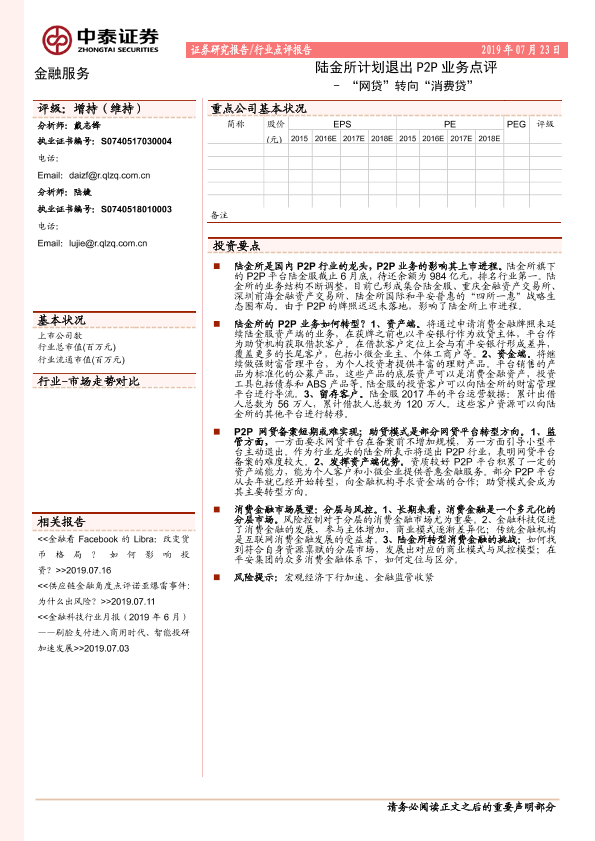 【中泰证券】【20190723】陆金所计划退出P2P业务点评-“网贷”转向“消费贷”-8页