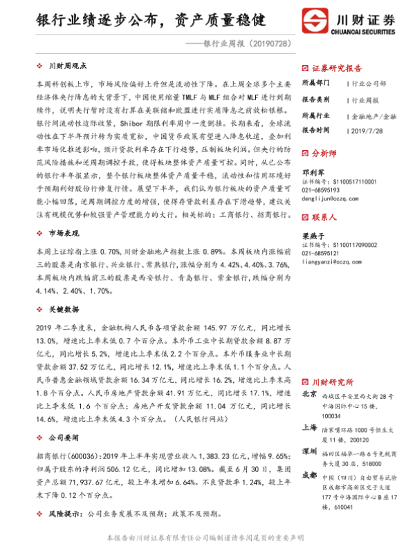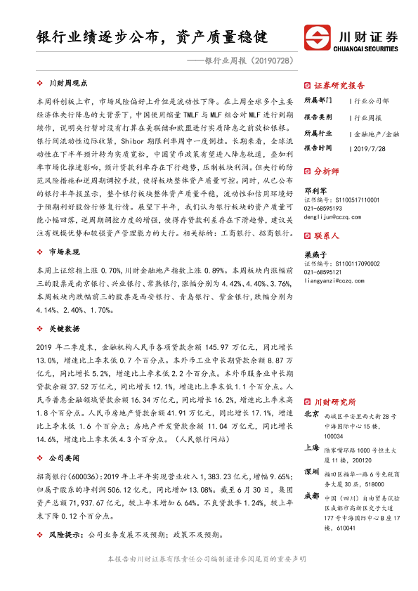 【川财证券】【20190728】银行业绩逐步公布,资产质量稳健-12页