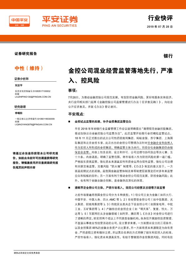 【平安证券】【20190728】银行行业快评:金控公司混业经营监管落地先行,严准入、控风险-4页